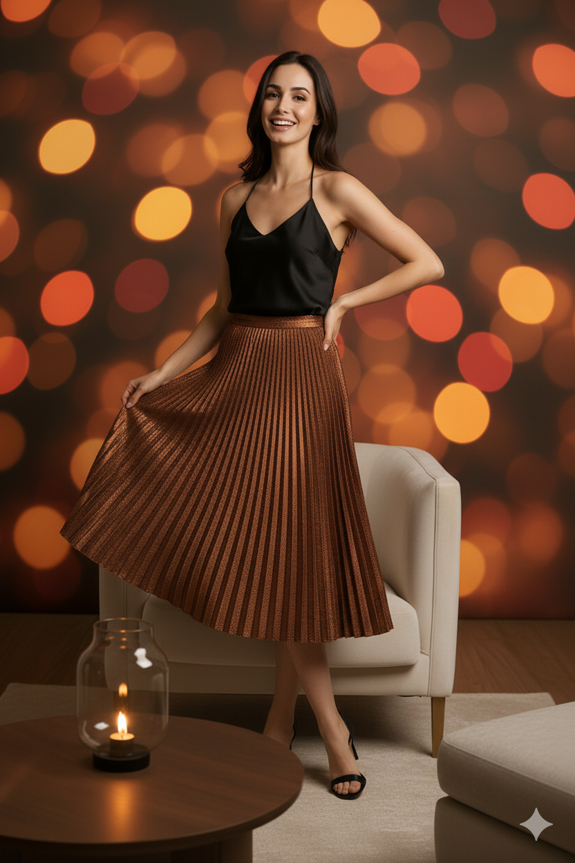 The “Molten Bronze” Pleated Midi Skirt: This skirt is a true showstopper. Crafted from a shimmering metallic fabric in a warm and radiant bronze hue, it features exquisite, razor-sharp sunray pleats. These pleats create beautiful dimension and movement, catching the light as you walk. The flattering midi length and comfortable waistband make it as wearable as it is beautiful.