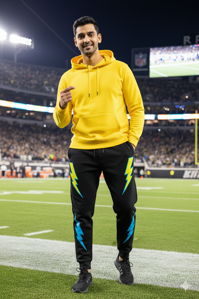 The “Lightning Strike” Graphic Joggers: These aren’t your average black joggers. They feature a modern, tapered fit with cuffed ankles for a clean silhouette. The true power lies in the bold lightning bolt graphics on the thighs, rendered in a striking gradient of electric blue and yellow, perfectly tying the whole look together.