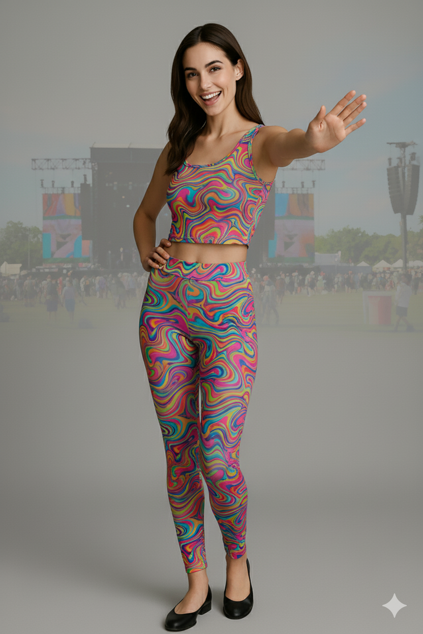 The “Electric Swirl” Leggings: These high-waisted leggings are designed to sculpt and support. The seamless, wide waistband ensures they stay perfectly in place no matter how you move, while the all-over psychedelic print creates a stunning, dynamic look.