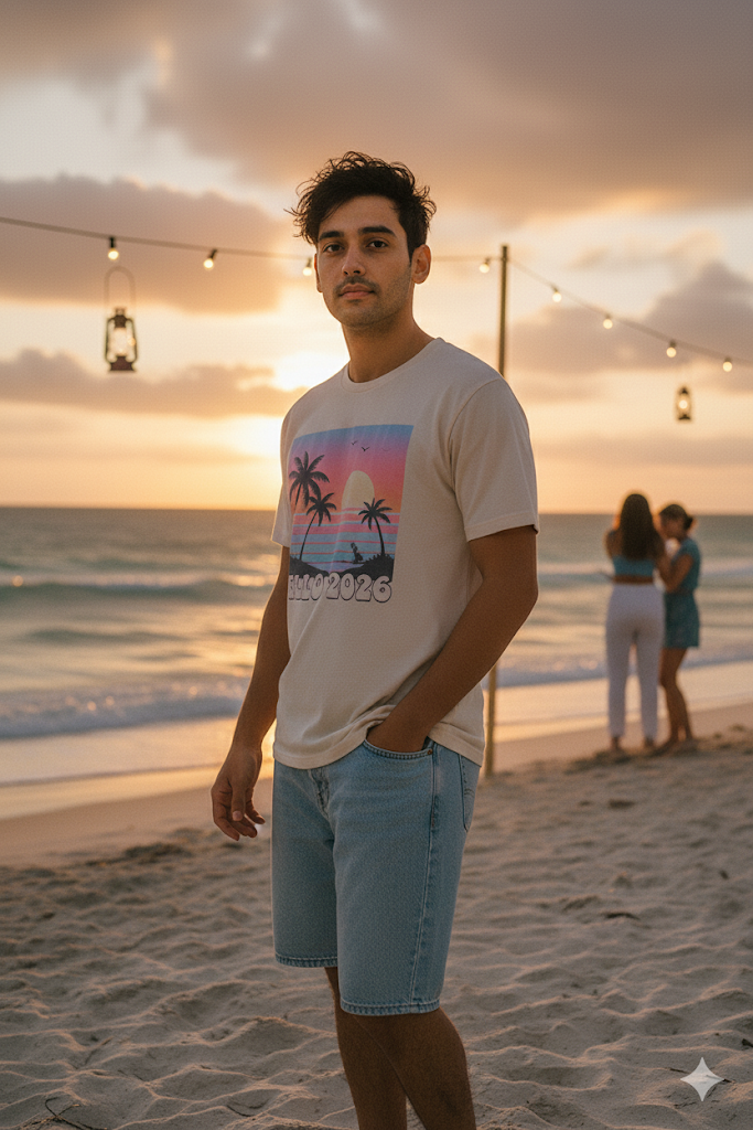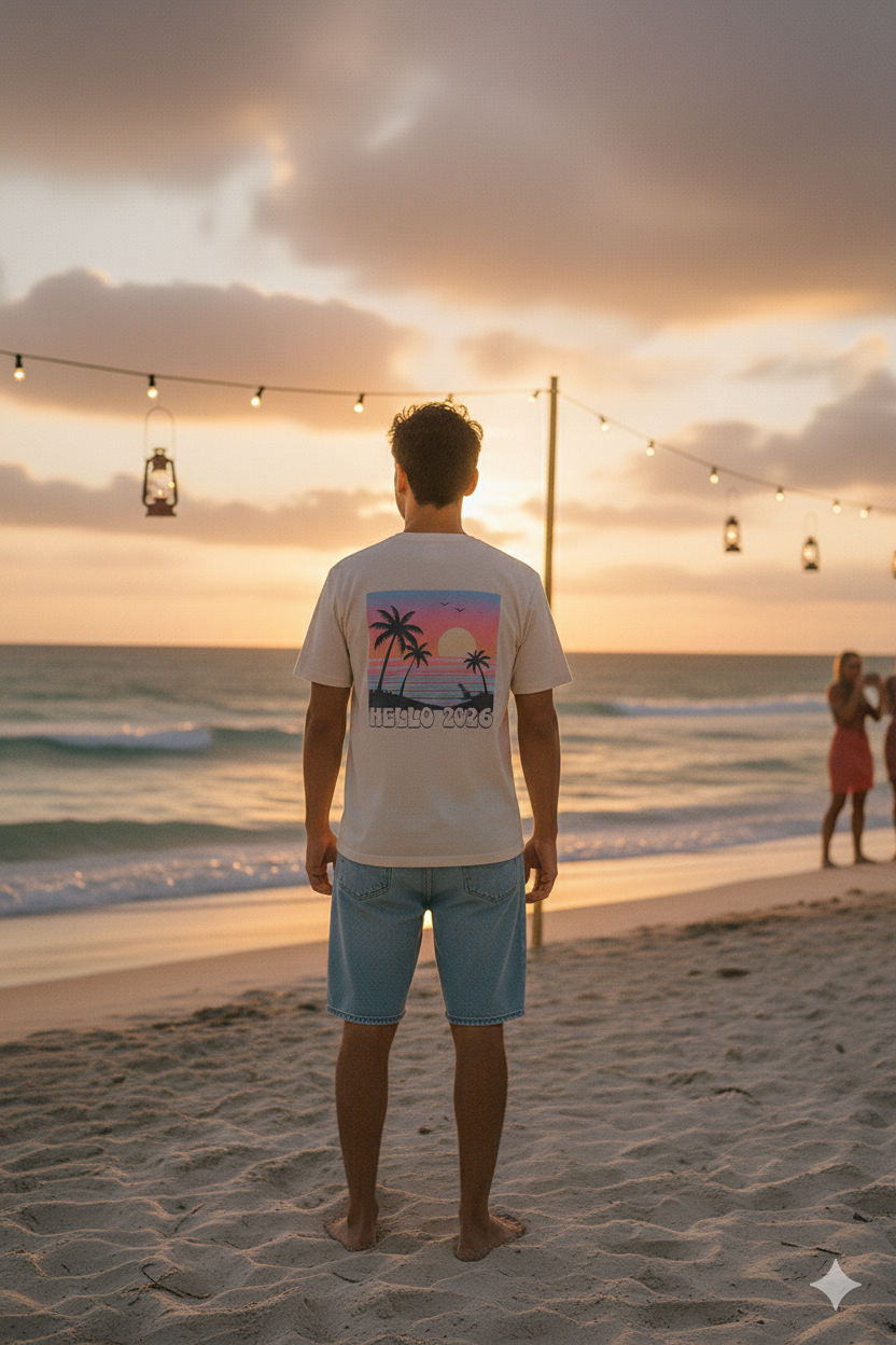 Welcome the new year in style with our Hello 2026 Men’s Sunset Beach T-Shirt 🌴☀️.
