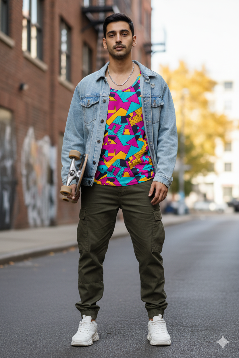 Get the complete street-style look with this all-in-one bundle. This kit combines three versatile and trendy pieces that are perfect for creating a cool, urban vibe. The Classic Vintage Blue Denim Jacket is a timeless layering piece, the Retro ’90s Geometric Print Tank Top adds a vibrant pop of color, and the Olive Green Cargo Pants provide a rugged, comfortable base. Whether you’re a skateboarder or just love the look, this bundle makes it easy to step out in style.