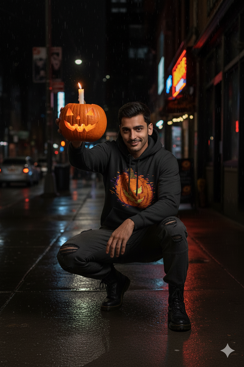 Celebrate Halloween with a modern, streetwear edge in our “Urban Glitch” Look. This effortlessly cool men’s outfit features our exclusive “Digital Pumpkin” hoodie with a unique glitch-art graphic, paired with our rugged and versatile “Night Ops” cargo pants. It’s the ultimate way to stay stylishly spooky all season long.