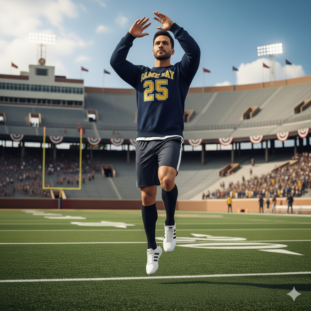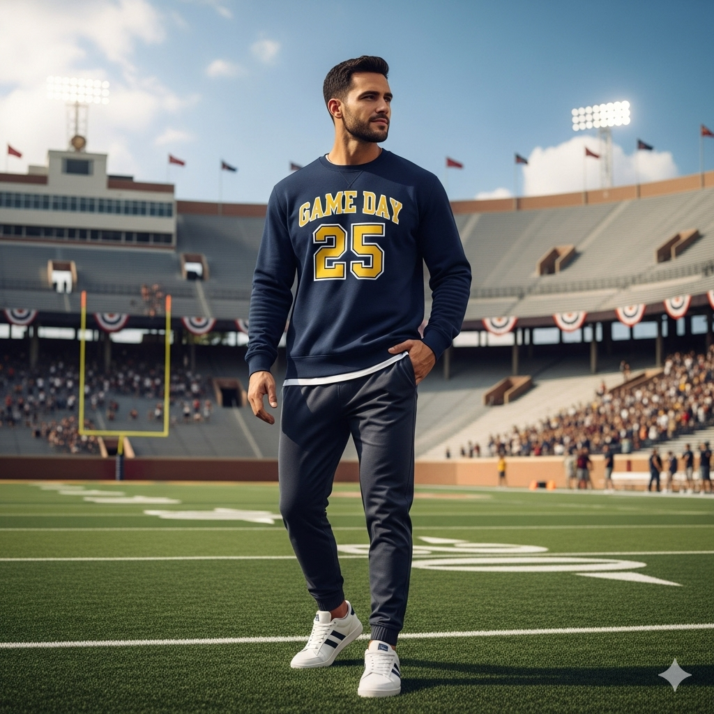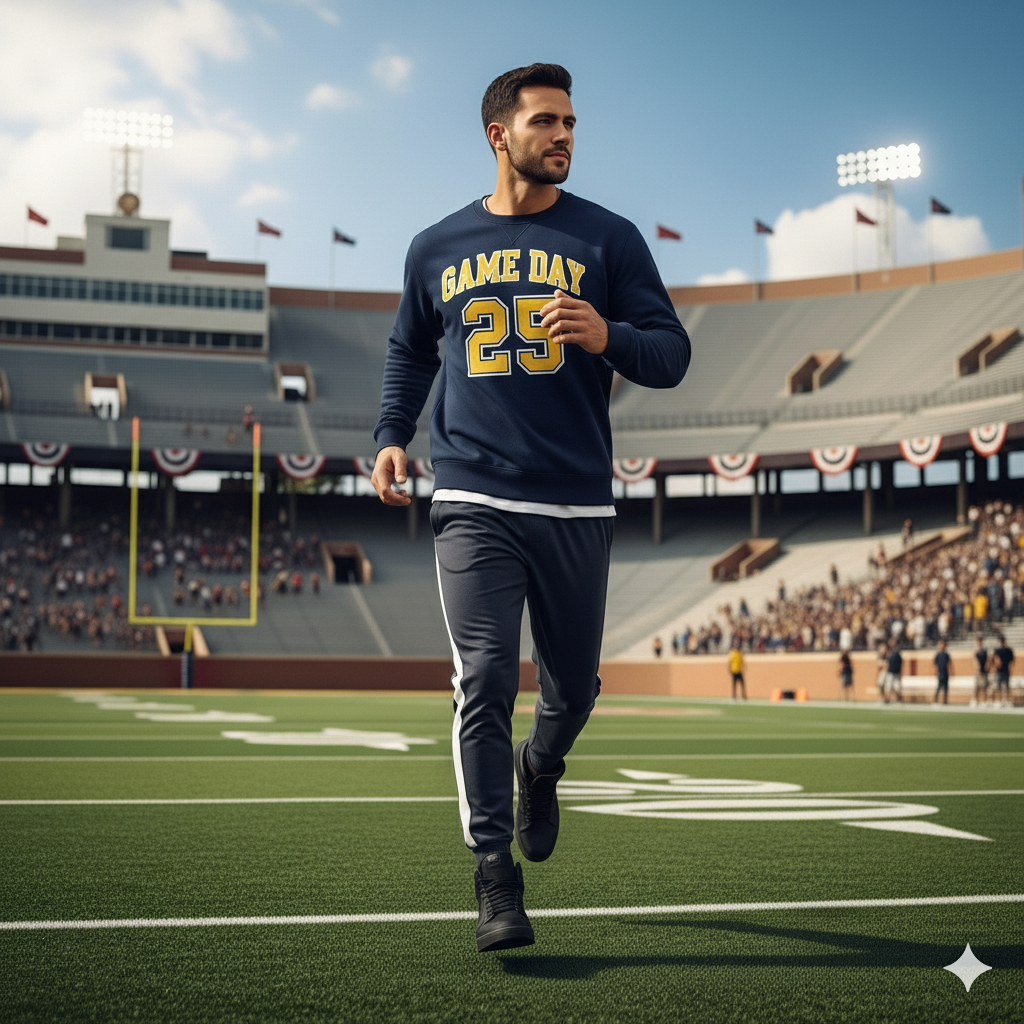 The “Game Day 25” Collegiate Sweatshirt: A true classic. This sweatshirt is crafted from a premium, soft fleece fabric in a versatile navy blue. The chest features a bold, vintage-style athletic graphic that reads “GAME DAY 25” in a contrasting golden yellow, giving it an authentic varsity feel. With its comfortable crew neck and relaxed fit, it’s a timeless piece you’ll wear for years to come.